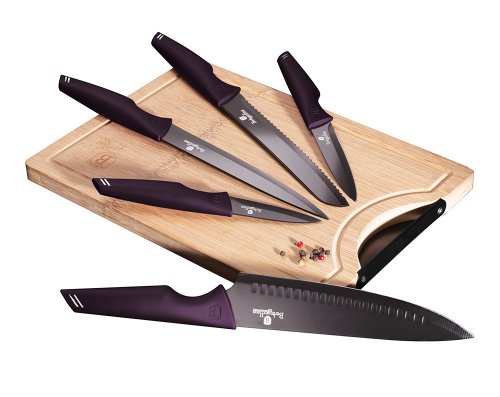 Prakticky vybavená sada nožov z fialovej kolekcie Purple Metallic. V sade nájdete 5 najpoužívanejších kuchynských nožov a navyše veľkú bambusovú doštičku s logom značky. Nerezové nože sú potiahnuté nepriľnavým antibakteriálnym povrchom, ktorý je šetrný k potravinám, navyše sa pri krájaní na nože nič nelepí. Ergonomicky tvarovaná rukoväť má na dotyk mäkčený povrch, ktorý je protišmykový, nôž sa v ruke veľmi pohodlne drží a nešmýka. Doštička z bambusového dreva s drážkou na odtekanie štiav možno pohodlne vziať za rukoväť a krájané potraviny premiestniť rovno do hrnca.