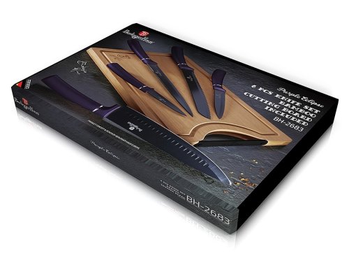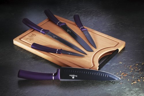 Sada nožov s nepriľnavým povrchom + doska 6 ks Purple Metallic Line je výbornou alternatívou pre kuchárov rôznych úrovní, na výrobu ktorých bol použitý kvalitný materiál: nerez oceľ s nepriľnavým povrchom, vynikajú perfektnou ostrosťou čepele a dizajnom . Veľmi oceníte aj ergonomicky tvarovanú rukoväť , vďaka ktorej sa vám nože budú skvele držať. Celá sada je dielom výrobcu BERLINGERHAUS, ktorá sa výrobe nožov venuje pomerne dlho a sú riadne odskúšané.