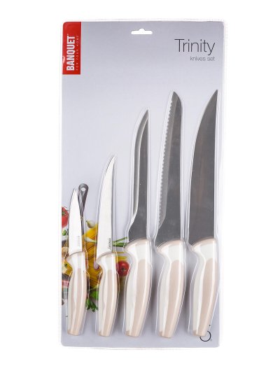 5 dielna sada TRINITY obsahuje praktický nôž 18,5 a 23,5 cm, porcovací nôž 32 cm, vykosťovací nôž 30 cm a nôž na chlieb 32 cm. Oceľové nože patria medzi nenahraditeľných pomocníkov v každej kuchyni. Výber vhodného noža nám uľahčí krájanie či porciovanie potravín.