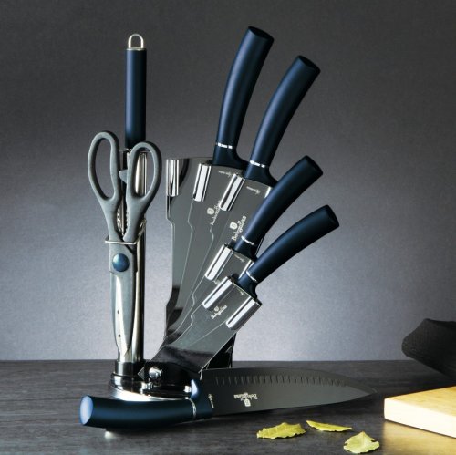 Súprava nožov z kolekcie Aqumarine Metallic Line od značky BerlingerHaus je opatrená antibakteriálnym nepriľnavým povrchom Diamond, vďaka ktorému nestráca potraviny svoje vitamíny a minerály. Protišmyková Soft-Touch rukoväť pohodlne padne do ruky a pri krájaní sa nešmýka. Kompletná sada 5tich nožov obsahuje navyše univerzálne nožnice a ocieľku, nože môžete kedykoľvek nabrúsiť a mať ich stále dokonale ostré! Atraktívny stojan v tvare vejára je otočný o 360 °, vďaka tomu máte nože vždy prehľadne po ruke.