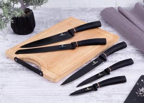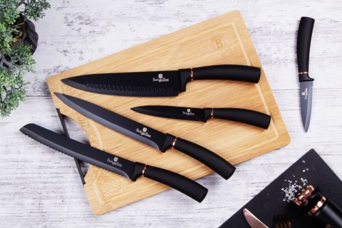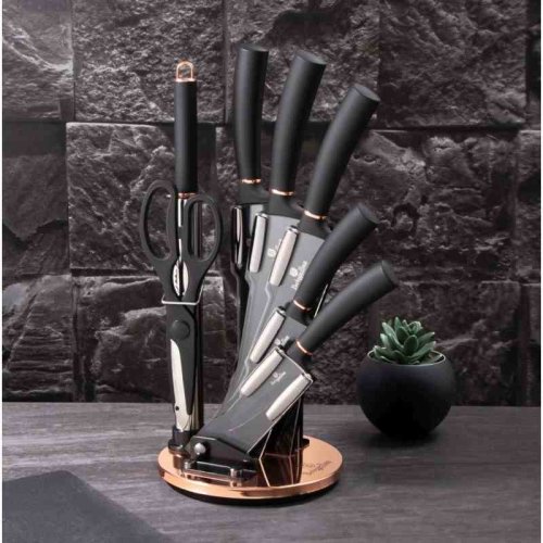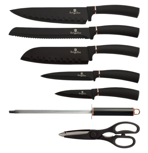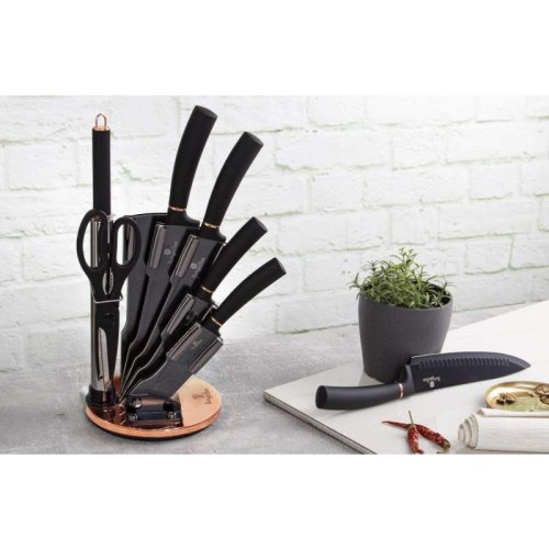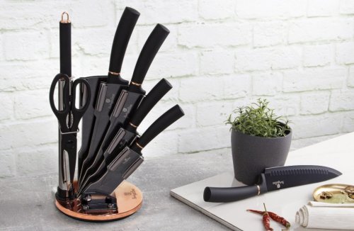 Súprava nožov v stojane 8 ks Black Rose Collection je výbornou alternatívou pre kuchárov rôznych úrovní, na ktorej výrobu bol použitý kvalitný materiál: nerez oceľ s nepriľnavým povrchom, vynikajú perfektnou ostrosťou čepele a dizajnom . Veľmi oceníte aj ergonomicky tvarovanú rukoväť , vďaka ktorej sa vám nože budú skvele držať. Celá sada je dielom výrobcu BERLINGERHAUS, ktorá sa výrobe nožov venuje pomerne dlho a sú riadne odskúšané.