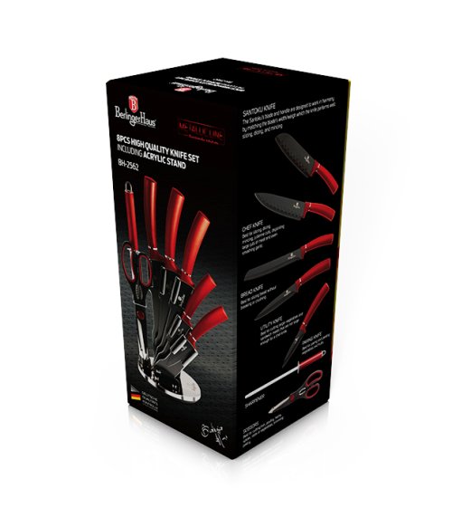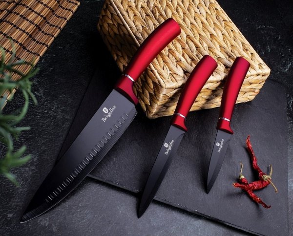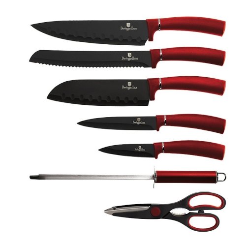 Sada nožov v stojane s nepriľnavým povrchom 8 ks Burgundy Metallic Line je výbornou alternatívou pre kuchárov rôznych úrovní, na výrobu ktorých bol použitý kvalitný materiál: nerez oceľ s nepriľnavým povrchom, vynikajú perfektnou ostrosťou čepele a dizajnom . Veľmi oceníte aj ergonomicky tvarovanú rukoväť , vďaka ktorej sa vám nože budú skvele držať. Celá sada je dielom výrobcu BERLINGERHAUS, ktorá sa výrobe nožov venuje pomerne dlho a sú riadne odskúšané.