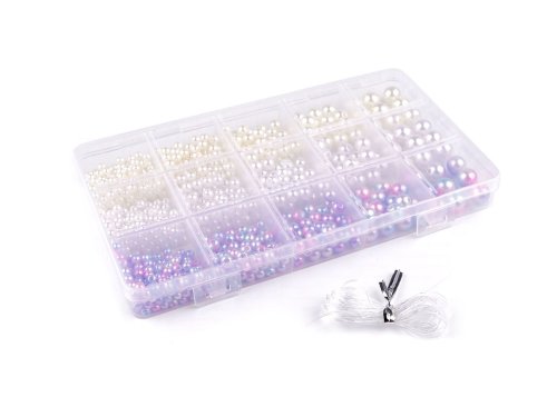 Plastový box obsahuje mix plastových perál a silikónovú gumičku na navliekanie. Nájdete v ňom korálky bielej a perlovej farby, as ružovo – modro – fialovým prechodom farieb. V boxe je od každej farby 5 rôznych veľkostí. Náš tip: sada bude bezchybným darčekom pre dievčatá, ktoré využijú korálky na náramky alebo náhrdelníky. Box obsahuje okrúhle korálky s priemerom 4; 5; 6; 8 a 10 mm s prievlakom 1,2 - 2 mm a gumičkou dlhou 1,8 m.