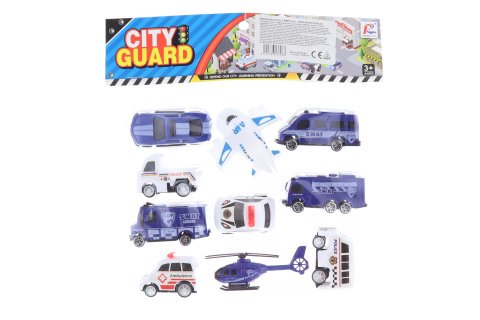 Sada policajných áut obsahuje 7 policajných plastových áut, 1x sanita, 1x lietadlo a 1x helikoptera . Veľkosť prostriedkov cca 6 cm. Rozmer balenia 20,5 x 23,5 cm. Vek 3 +