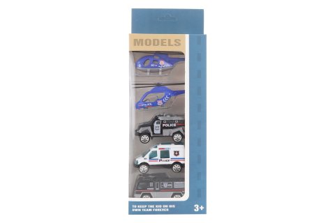 Súprava policajných kovových áut. Balenie obsahuje 2 helikoptéry a 3 autá. Rozmery balenia cca 10 x 27 x 3,5 cm. Vek 3+