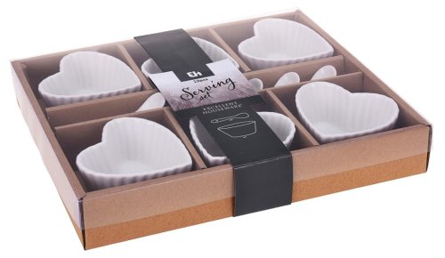 • materiál: biely porcelán - perfektný pre servírovanie predjedál, pochutín, dezertov, dipov a omáčok - rozmery jednej misky cca: 9 x 4 cm - žiaruvzdorné do 220 ° C, možno využiť aj na zapekanie v rúre - vhodné do umývačky riadu - sada 12 kusov obsahuje:- 6 x porcelánová miska- 6 x porcelánová lyžička