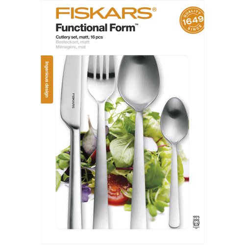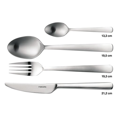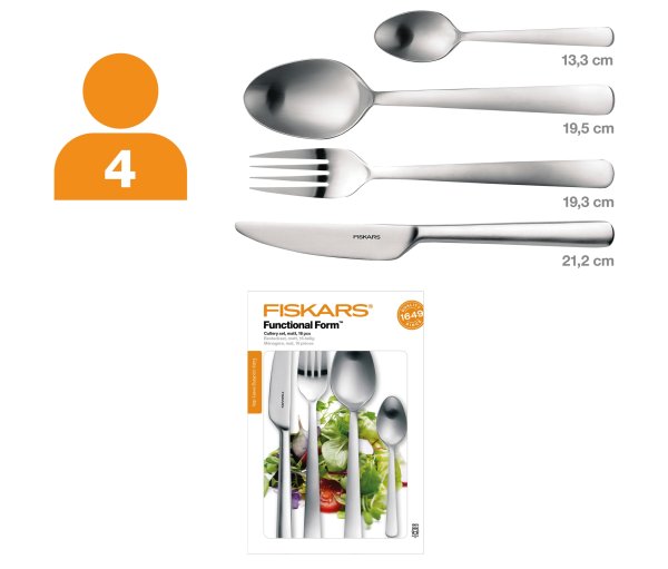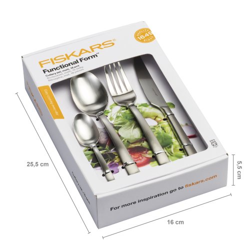 Sada 4 druhov príborov, celkom 16 kusov z vysoko kvalitnej nerezovej ocele. Možno umývať v umývačke riadu. Výška: 55 mm, dĺžka: 250 mm, šírka: 165 mm, hmotnosť: 978 g.