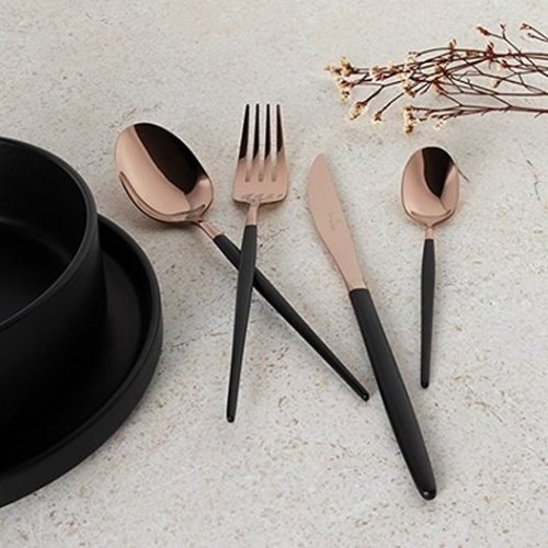Táto sada príborov je vyrobená z vysoko kvalitnej nerezovej ocele s PVD povlakom z ružového zlata a matne čiernou rukoväťou. Sada obsahuje 6 stolných nožov (7,0 mm), 6 stolných vidličiek (4,0 mm), 6 kuchynských lyžíc (4,0 mm) a 6 čajových lyžičiek (2,7 mm). Elegantný dizajn s matne čiernou rukoväťou a zrkadlovou úpravou dodáva príborom moderný vzhľad, ktorý sa hodí do každej kuchyne.