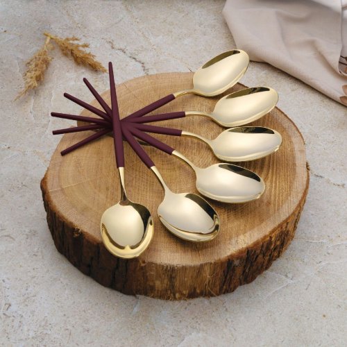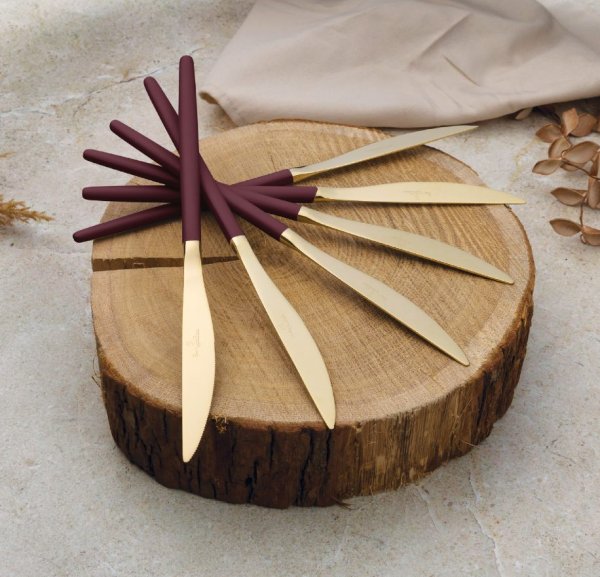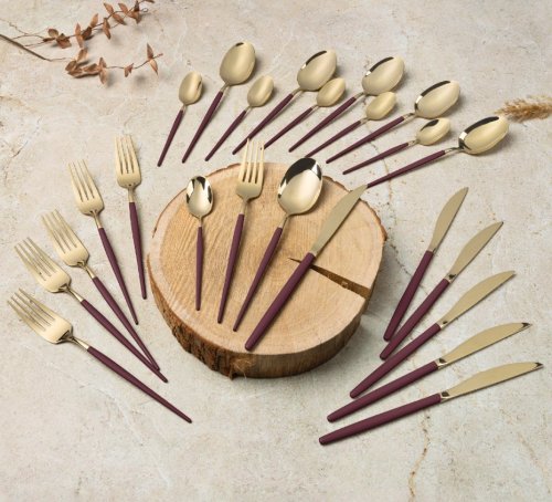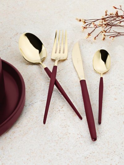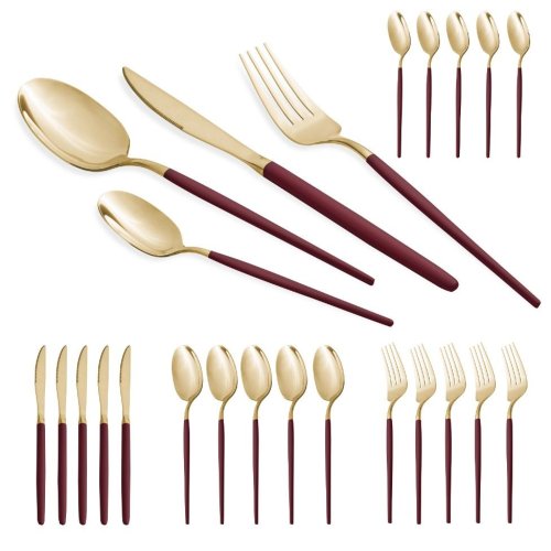 - Materiál: Nerezová oceľ s leštenou povrchovou úpravou - Sada obsahuje: - Nôž 6 ks 7,0 mm - Vidlička 6 ks 4,0 mm - Lyžica 6 ks 4,0 mm - Čajová lyžička 6 ks 2,7 mm - Farba: zlatá champagne / červená burgundy- …