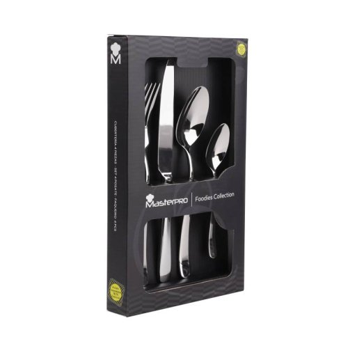 •Kompletné príbory, moderné a ľahko sa udržujú a umývajú. Nerezové príbory sa veľmi ľahko umývajú. Zostanú lesklé umývaním vo vlažnej vode alebo aj vložením do umývačky. •Veľmi odolné moderné príbory s dlhou životnosťou. Nerezová oceľ je od prírody materiál, ktorý nehrdzavie a dobre drží v priebehu času. Pri dobrej údržbe zaistia príbory dlhú životnosť. • Praktické a jednoduché použitie. Príbor je ľahký a vďaka hrúbke jeho rukoväte je s ním manipulácia pre väčšinu používateľov veľmi praktická. •Bez PFOA, PTFE alebo iných látok toxických pre zdravie. Sú vyrobené z nerezovej ocele, neuvoľňujú žiadne častice a sú ideálne do kuchyne. • Kompletné nerezové príbory. Spĺňa všetky potreby stola a môže byť použitý s rodinou alebo pre hostí . Masterpro ponúka kompletné moderné sady príborov z nerezovej ocele as lesklou povrchovou úpravou. Nerezová oceľ je prirodzene antikorózny materiál, ktorý vydrží po celý život. Sú ľahké a rukoväte sú hrubé, teda príjemné na dotyk a neobsahujú PFOA, PTFE a ďalšie škodlivé toxíny. Tieto kompletné sady príborov sa navyše ľahko čistia a je možné ich umývať v umývačke. Na zaistenie dlhšej životnosti je potrebné ho po vypraní vysušiť. Pokrýva všetky potreby stolovania pri každom jedle a je možné ho použiť pri stolovaní s rodinou aj hosťami.