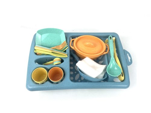 Táto ekologická sada riadu je vyrobená z pšeničného materiálu, čo ju robí šetrnou k prírode. Obsahuje 27 kusov, ktoré sú ideálne na detské hranie na varenie a stolovanie.