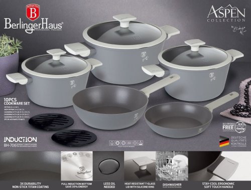 Sada riadu Berlingerhaus Aspen Collection sa skladá z 2 panvíc, 3 hrncov s pokrievkami a 2 podložiek pod horúce kastróly. Využijete ich na každodennú prípravu svojich obľúbených pokrmov. Riad sa stane vašim univerzálnym pomocníkom pri varení, dusení aj smažení . Vnútorná vrstva všetkých kastrólov a panvíc je potiahnutá trojvrstvovým titánovým povrchom . Vyniká perfektnou nepriľnavosťou , preto sa vám pripravované jedlá nepripaľujú a riad ľahko očistíte. Môžete ho dokonca umyť aj v umývačke riadu. Pri varení navyše použijete menšie množstvo tuku či oleja .