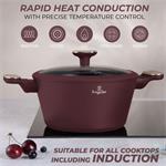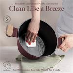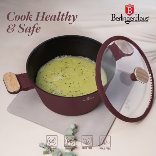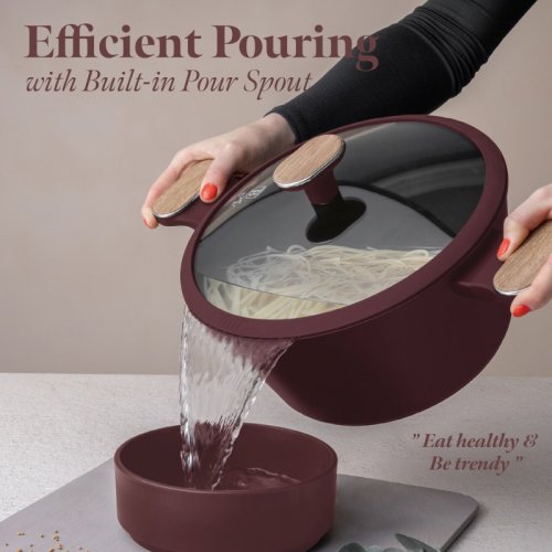 Kovaný hliník s trojitým nepriľnavým povrchom TitanPro snúbi rýchly rozvod tepla a ľahké varenie bez pripaľovania. Cediace pokrievky z tvrdeného skla s otvorom na paru dávajú plnú kontrolu nad varením a ušetria čas aj spotrebu riadu. Ergonomické rukoväte s mäkkým povrchom zaisťujú pohodlný úchop a neprenášajú teplo. Vďaka modernej kombinácii bordovej farby a drevených detailov pôsobí sada elegantne, preto je vhodná aj na priame servírovanie na stôl.