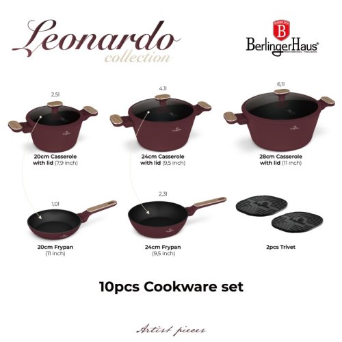 Vylaďte svoju kuchyňu do posledného detailu so sadou riadu Berlingerhaus Leonardo Nordic Collection . Elegantná matná bordó a jemné drevené detaily sú tým pravým doplnkom do každej štýlovej kuchyne. 10 kusov riadu pokryje varenie od raňajok pre dvoch až po nedeľný rodinný obed.