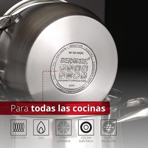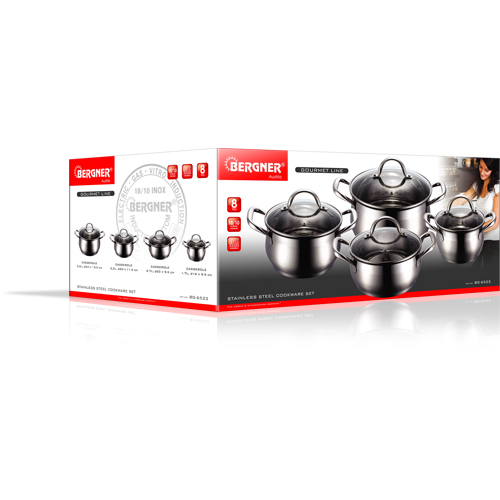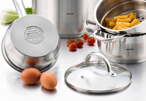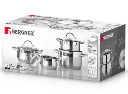 -Indukčný riad Bergner-materiál: nerezová oceľ 18/10-strieborná farba-sada obsahuje:-hrniec priemer 16 x 7,5 cm, 1,8 l-hrniec priemer 16 x 9,5 cm, 2 l-hrniec priemer 20 x11 ,5 cm, 3 l-hrniec priemer 24 x 13,5 cm, 6 l-sklenené pokrievky