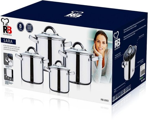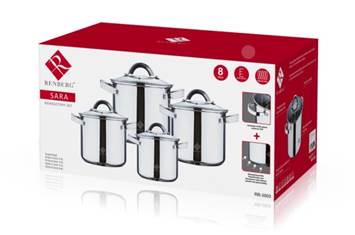 -indukčný riad -materiál: nerezová oceľ-lesklý povrch-strieborné celonerezové rukoväte-sklenené pokrievky-vnútorná odmerná stupnica-hrnce:- 16 x 14,5 cm, 2,9L- 18 x 16 cm, 4,0L- 20 x 17, 5 cm, 5,4 L-24 x 19,5 cm, 8,8 L