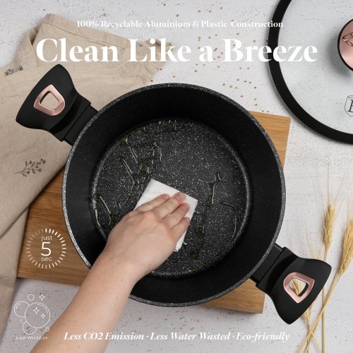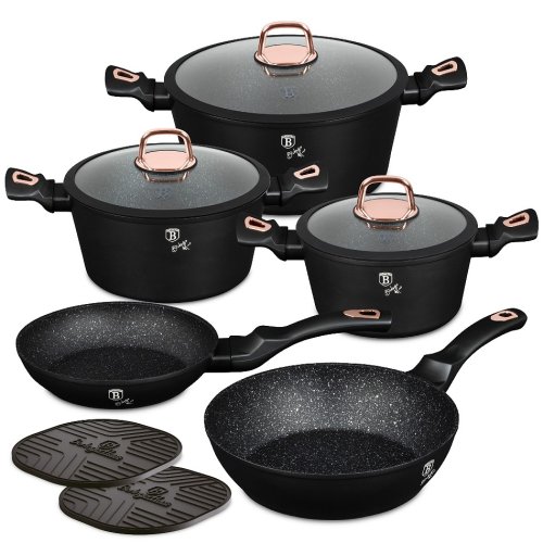 - doménou tejto sady je 3-vrstvový povrch s mramorovým dizajnom charakteristický svojou dokonalou nepriľnavosťou, žiadne potraviny sa nepripaľujú a vďaka tomu sa kastróly aj panvice veľmi ľahko čistia