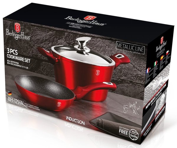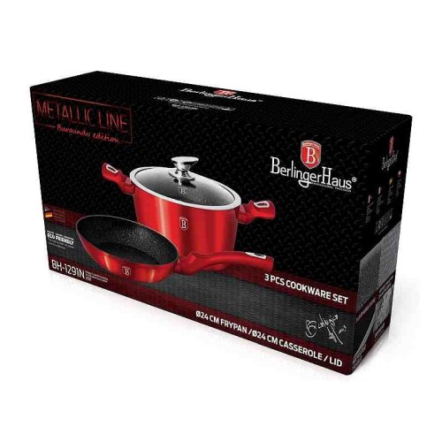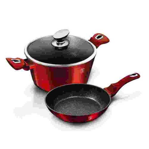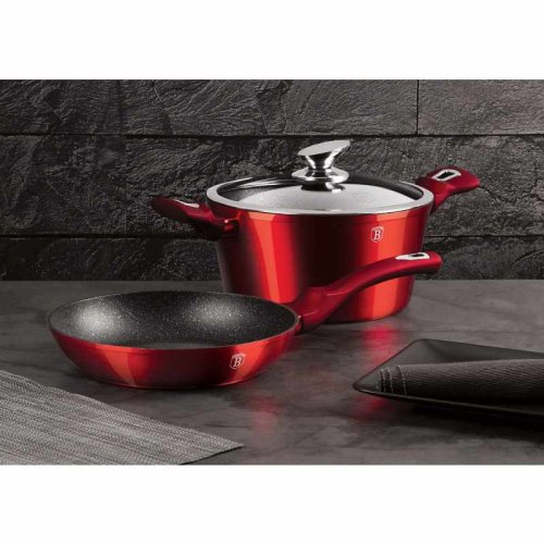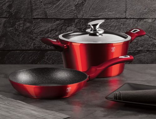 - materiál: kovaný hliník s mramorovým povrchom- farba: červená burgundy, metalická- Sada 3 ks obsahuje:- Panvica pr. 24 x 5 cm- Hrnce s pokrievkou pr. 24 x 12 cm - 3 vrstvový nepriľnavý povrch s mramorovým…