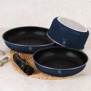 Minimalistický matný povrch v kombinácii modrej a šedej drevo dodáva sade elegantný vzhľad, zatiaľ čo turbo indukčné dno zaisťuje rýchle a rovnomerné varenie. Veká z tvrdeného skla so systémom Soft Close umožňujú bezpečné manipulovanie a kontrolu varenia.