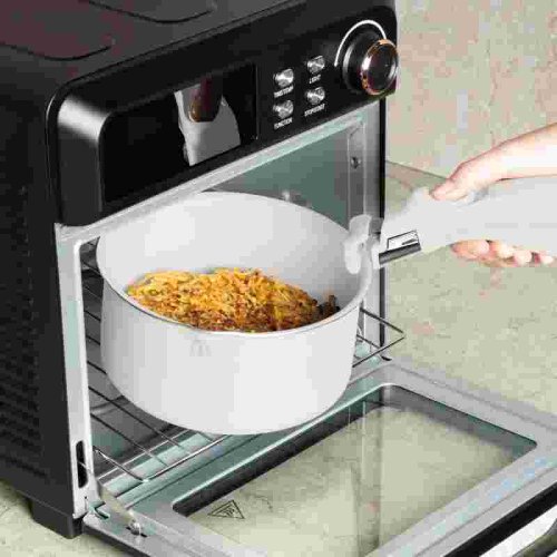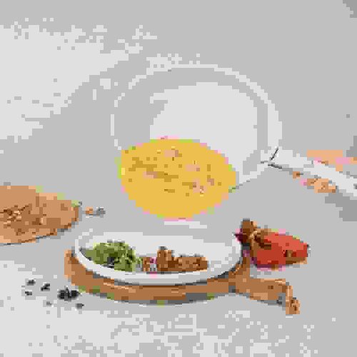 Matný povrch v kombinácii krémovej a drevenej farby dodáva sade štýlový a moderný vzhľad, zatiaľ čo turbo indukčné dno zaisťuje rýchle a rovnomerné varenie. Veká z tvrdeného skla so silikónovým systémom Soft Close umožňujú bezpečné zatváranie a kontrolu varenia.
