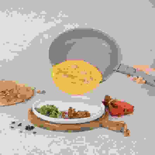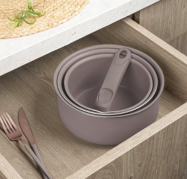 Elegantný matný povrch vo farbe taupe s prvkami svetlého dreva dodáva sade jedinečný vzhľad, zatiaľ čo turbo indukčné dno poskytuje rýchle a rovnomerné varenie. Veká z tvrdeného skla s tepelne odolným silikónovým systémom Soft Close zaručujú bezpečné a tiché zatváranie.