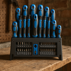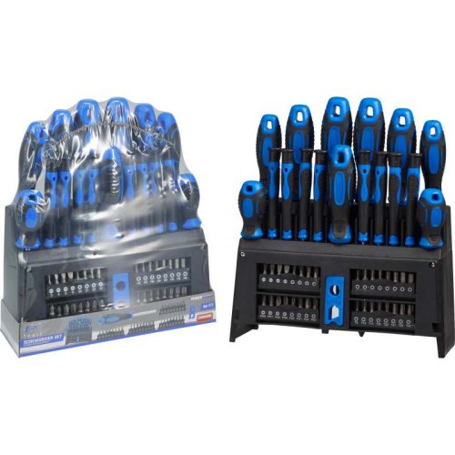 Kompletná sada skrutkovačov v modro-čiernom prevedení, balené v kartónovom zásobníku s PP zmrštovacím a papierovým obalom.