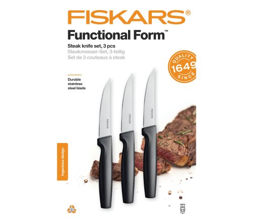 Steakový nôž má vrúbkované 12 cm dlhé ostrie. Využijete ho ako jedálenský nôž na steaky, ale môžete s ním tiež krájať potraviny s kôrkou, ako napríklad čerstvé pečivo či menší chlieb. Výborne sa s ním krájajú aj potraviny s tenkou šupkou, obzvlášť paradajky alebo broskyne. Súprava obsahuje tri steakové nože. Hmotnosť: 0,183 kg. Pôvodné FIS číslo 1014280.