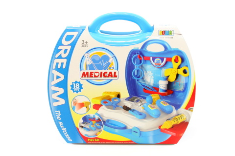 Doktorská sada obsahuje: kufrík o veľkosti cca 22x17cm, 1x okuliare, 1x pilulky, 2x nožnice, 7x lekárske nástroje. Vek 3+
