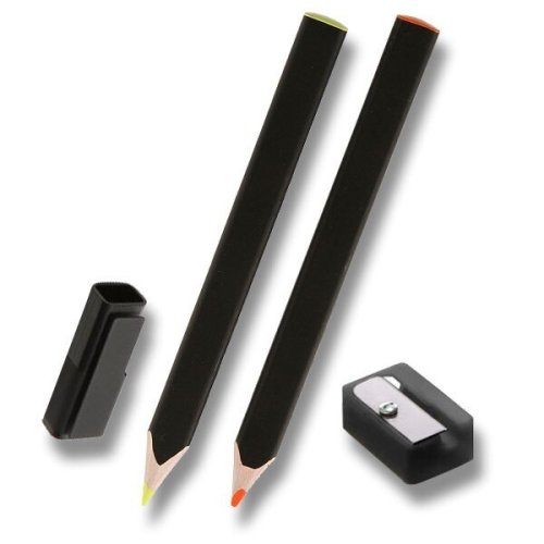 Súprava dvoch zvýrazňovacích pasteliek, uzáveru a strúhadla. Balenie obsahuje 24 samolepiek. moderný hranatý tvar so zaoblenými rohmi vyrobené z lipového dreva majú svietivo žltú a oranžovú tuhu