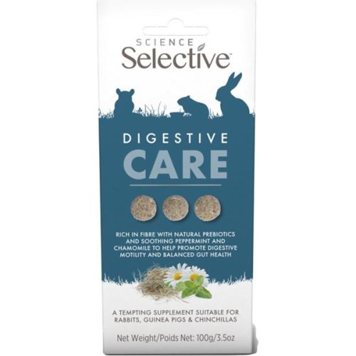 Chutné maškrty Science Selective Digestive Care sú bohaté na vlákninu, obsahujú prírodné prebiotiká a upokojujúcu mätu piepornú a harmanček. Podporujú zdravie čriev a celkovú rovnováhu tráviacej sústavy králikov, morčiat a činčil sa sklonmi k plynatosti, nadúvaniu a tvorbe chumáčov chlpov (trichobezoárov) v žalúdku. Maškrty sú ideálne na kŕmenie z ruky – na nadviazanie či prehĺbenie vzťahu s drobným maznáčikom. Zloženie je čisto prírodné, bez umelých farbív, príchutí a pridaných cukrov. Hlavné prednosti: