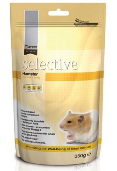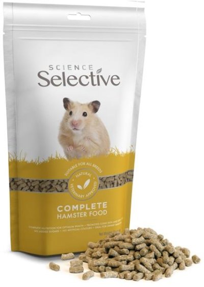 Supreme Science Selective Hamster – škrečok je veľmi chutné, nutrične kompletné a vyvážené krmivo pre škrečky v každom veku. Táto unikátna pečená receptúra s identickými kúskami zaisťuje, že si váš škrečok nebude vyberať z krmiva svoje obľúbené kúsky tak, ako to môže robiť pri nehomogénnych kŕmnych zmesiach. Tu máte istotu, že škrečok z krmiva získa všetko, čo môže krmivo poskytnúť pre jeho zdravie a pohodu. Krmivo obsahuje chutné celozrnné obilniny. Obsiahnuté ľanové semienko je vynikajúcim prírodným zdrojom Omega 3 a 6 mastných kyselín a pomáha udržiavať lesklú srsť. Krmivo je prirodzene chutné, bez pridaného cukru a neobsahuje ani umelé farbivá. Vďaka presnému starostlivému zloženiu krmiva nie je potrebné pridávať ďalšie nutričné doplnky, zviera v krmive dostáva všetky vitamíny a minerály, ktoré potrebuje na zabezpečenie dlhodobého zdravia. Zloženie: celozrnná pšeničná múka, sójová múčka, jačmeň, ovos, ľanové semienko, sójový olej, hydrogénfosforečnan vápenatý, uhličitan vápenatý, soľ. Nutričné doplnkové látky / kg: vitamín A 15000 IU , vitamín D3 1500 IU , monohydrát síranu železnatého 152 mg, jodičnan vápenatý bezvodý 1,5 mg, pentahydrát síranu meďnatého 20 mg, oxid mangán ný 0,2 mg. Analytické zložky: hrubý proteín 19%, hrubá vláknina 5%, hrubé oleje a tuky 5%, hrubý popol 5,5% Kŕmny návod: Priemerný dospelý škrečok denne potrebuje približne 5 – 10 g krmiva Supreme Science Selective Hamster – škrečok. Krmivá radu Supreme Selective je možné zvieratám podávať neobmedzene podľa chuti, je však nutné pravidelne kontrolovať telesnú hmotnosť a celkovú kondíciu zvieraťa. Zaistite neobmedzený prístup k čerstvej vode.