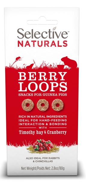 Zdravé prírodné maškrty Selective Naturals v tvare krúžkov pre morčatá, králiky, činčily a ďalšie bylinožravé drobné cicavce. Ideálne na podávanie z ruky, ktoré zbližuje a pomáha vytváraniu bližšieho vzťahu so zvieraťom. Krúžky Berry Loops s bojínkom a brusnicami. Upečené z prírodných surovín v pekárni Supreme v srdci Suffolku.