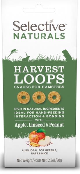 Zdravé prírodné maškrty Selective Naturals v tvare krúžkov pre škrečky, potkany a ďalšie všežravé drobné cicavce. Ideálne na podávanie z ruky, ktoré zbližuje a pomáha vytváraniu bližšieho vzťahu so zvieraťom. Krúžky Harvest Loops s jablkami, ľanovým semienkom a arašidy. Upečené z prírodných surovín v pekárni Supreme v srdci Suffolku.