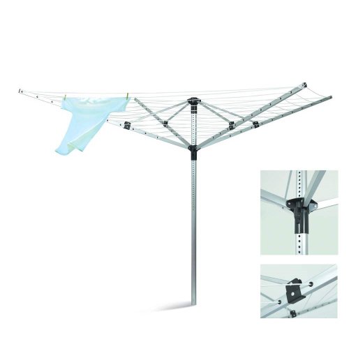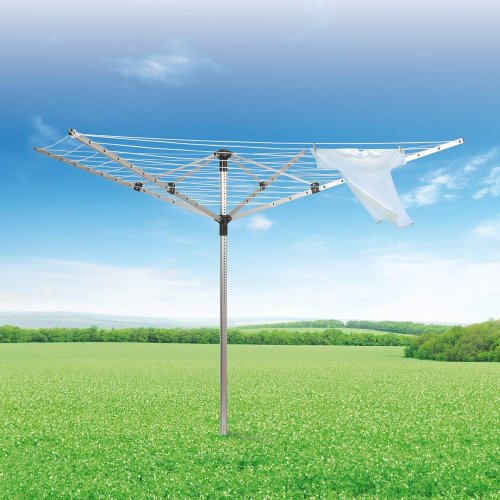 Vonkajší sušiak 50 m, 4 ramená, ktorý určite oceníte v letných mesiacoch, kedy môžete sušiak umiestniť kdekoľvek na vašu záhradu. Do zeme sa upeňuje pomocou zemnej objímky, ktorá je súčasťou balenia.