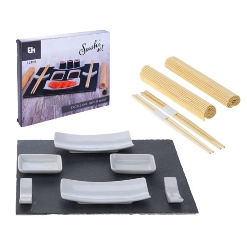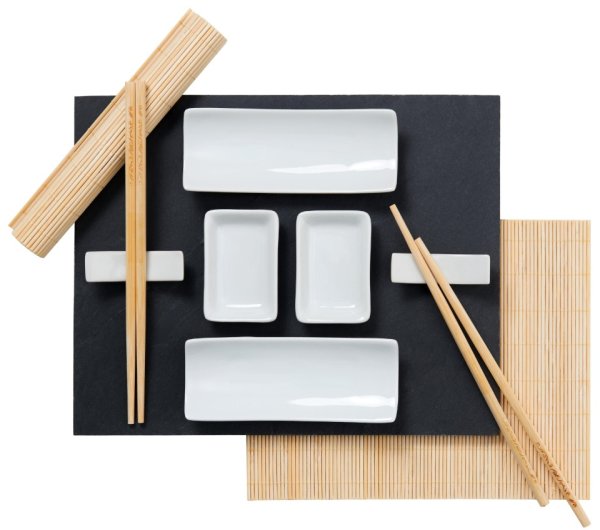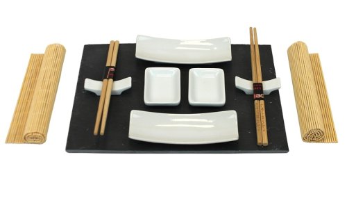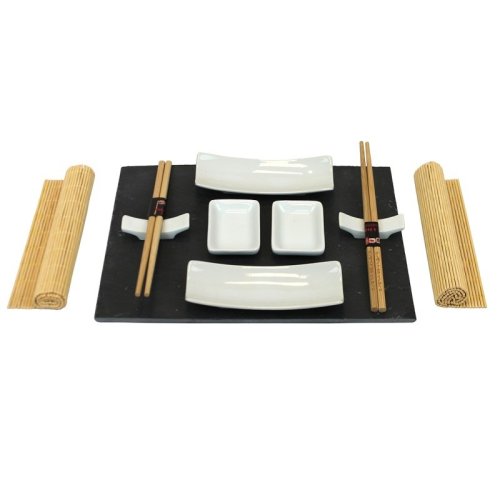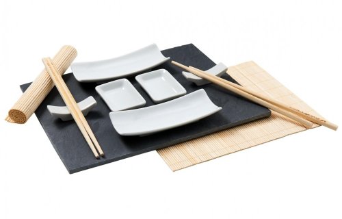 • kompletný sushi set pre 2 osoby - autentické materiály rovnako ako v japonskej kuchyni - bridlicová servírovacia doska, nádoby z bieleho porcelánu a bambusové paličky aj prestieranie - skvelý darček pre milovníkov orientálnej kuchyne - Sada 11 ks obsahuje: - 1x servírovacia 4d 0.5 cm - 2x servírovací porcelánový tanier 14.5 x 5.5 x 2 cm - 2x miska na omáčku 8 x 5.4 x 1.6 cm - 2x držiak na paličky 7 x 2 x 1.8 cm - 2x pár bambusových paličiek 24 cm
