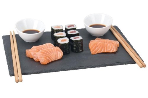 • kompletný sushi set pre 1 alebo 2 osoby - autentické materiály rovnako ako v japonskej kuchyni - bridlicová servírovacia doska, nádoby z bieleho porcelánu a bambusové paličky - skvelý darček pre milovníkov orientálnej kuchyne - Sada 7 ks obsahuje: - 1x servírovacia x30 2 8 x 3.8 cm- 2 páry bambusových paličiek 24 cm