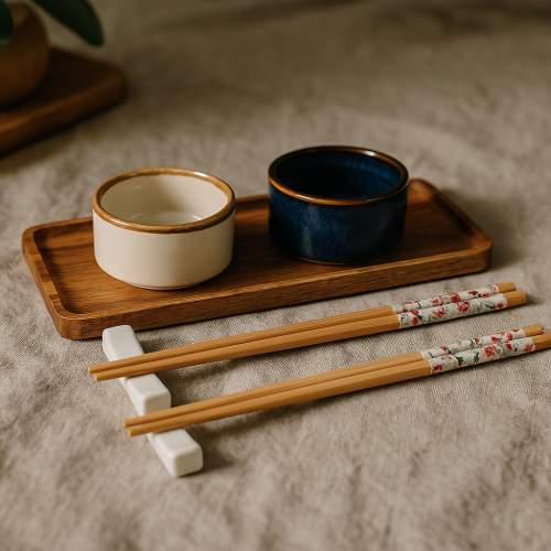 Štýlová sada na servírovanie suši kombinuje prírodné materiály a elegantný dizajn. Obsahuje servírovaciu tácku z akáciového dreva, porcelánové misky a držiak na paličky doplnený bambusovými paličkami. Ideálne pre milovníkov ázijskej kuchyne aj ako originálny darček.