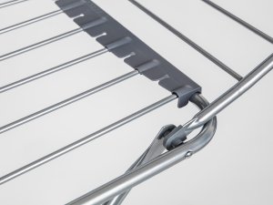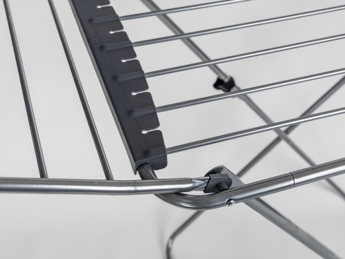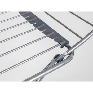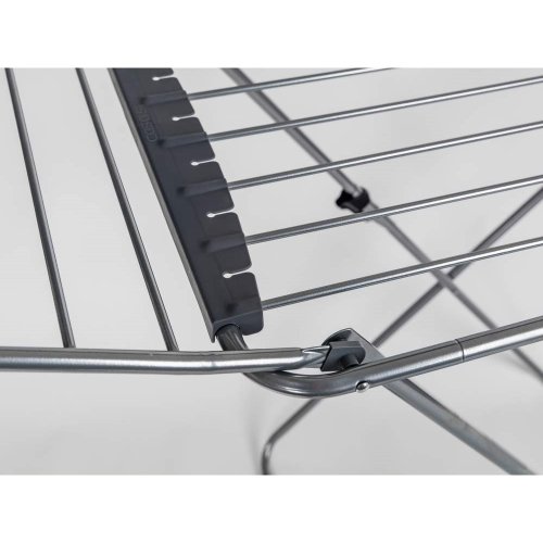 Stabilný prenosný sušiak na bielizeň ponúka cca 20 metrov sušiacej plochy, čo predstavuje až dve plné práčky bielizne. Bočné krídla sú vhodné na sušenie dlhšej bielizne. Praktickým pomocníkom je držiak na sušenie ponožiek. Veľkou výhodou je stabilná konštrukcia zo strieborných trubiek, doplnených plastovými držiakmi v šedej farbe. Bezpečnému použitiu napomáha aj detský bezpečnostný zámok, obmedzujúci možnosť nechceného zloženia a prípadného pádu.