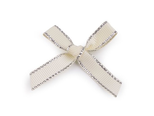 Svadobné mašličky využijete na výrobu voničiek aj rôznych dekorácií. Sú pevné, uviazané z obojstrannej rypsovej stuhy širokej 10 mm, ktorá je po bokoch pretkaná lurexom. Dodajú elegantný a žiarivý nádych svadobčanom, ale aj vašim iným tvorivým projektom. Oceníte ju aj ako skvelý detail na ozdobnom balení darčekov.