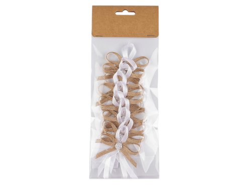 Svadobné jutové mašličky v boho štýle sú veľmi populárne. Slúži predovšetkým na ozdobenie chlopne ženícha a svadobčanov. Sú kvalitné, ručne spracované. Skladajú sa z jutovej mašle, saténovej stuhy, drobnej aplikácie s perlovým leskom a špendlíka. Mašličky môžete použiť aj na aranžovanie rôznych svadobných dekorácií. Mašličky sú zabalené po 10 ks v sáčku s papierovou kartou na zavesenie na predajný stojan. Variant č. 1 je s ružičkou. Variant č. 2 je so srdiečkom.