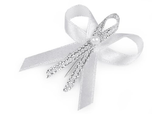 Svadobná mašlička slúži na svadobné účely. Využijete ich na ozdobenie klopy ženícha a svadobčanov. [Je kvalitná, ručne spracovaná.] Skladá sa z dvoch saténových stuh o šírke 6 mm, perličky a špendlíka. Mašličku môžete použiť aj na aranžovanie rôznych svadobných dekorácií.