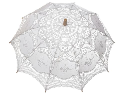 Romantický krajkový deštník, kde se jemná krajka prolíná s bavlněným vyšívaným plátnem v nádherných, propracovaných vzorech. Hodí se pro nevěsty v jejich svatební den, na zahradní slavnosti i pro romantické focení v exteriéru nebo ateliéru. Můžete jej v případě hezkého počasí využít jako doplněk při focení. Není vhodný do deště. Deštník je holový, středovou tyč i rukojeť má dřevěnou. Kovová konstrukce deštníku se skládá z 10 polí, zajišťuje vysokou pevnost a stabilitu. Hloubka deštníku je cca 23 cm.
