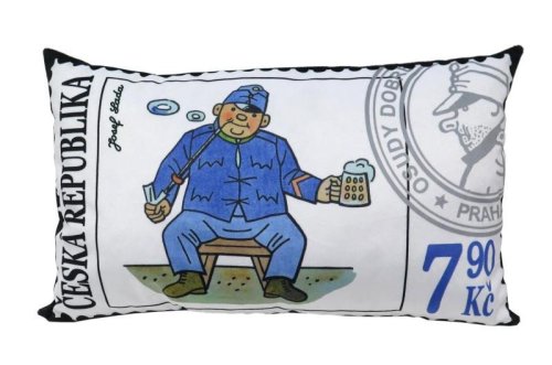Mäkký vankúš s motívom dobrého vojaka Švejka od Jozefa Lady, vhodný na cesty aj ako dekorácia. Materiál mikrovelúr, obrázok tlač, náplň duté vlákno. Prateľný. Pranie na 30 ° C, 100% polyester. Vyrobené v SR.