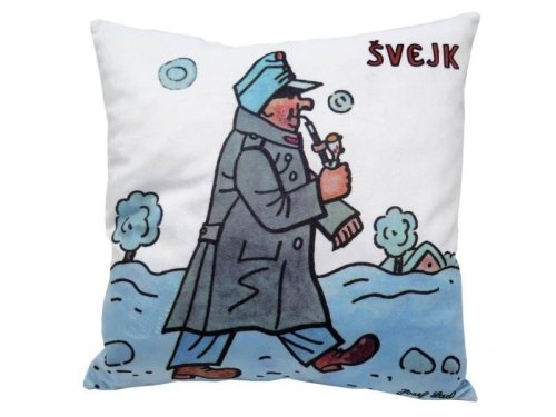 Mäkký vankúš s motívom dobrého vojaka Švejka od Jozefa Lady, vhodný na cesty aj ako dekorácia. Materiál mikrovelúr, obrázok tlač, náplň duté vlákno. Prateľný. Pranie na 30 ° C, 100% polyester. Vyrobené v SR.