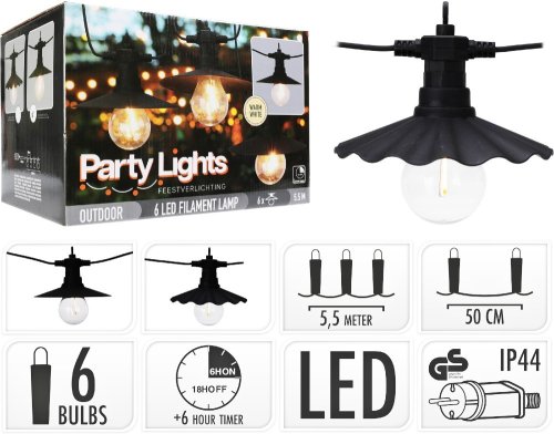 Svetelná reťaz LED PARTY 6 žiaroviek, celková dĺžka 5,5 m, vzdialenosť žiaroviek 50 cm, prívodný kábel 3 m, farba LED: teplá biela, 230 V, IP 444 adaptér