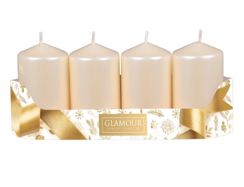 Súprava adventných sviečok. Majú tvar valca a povrch majú hladký, v úprave metalický lesk. Sú jednoduché a zároveň veľmi efektné. Doba horenia: 30 hodín. Rozmer: priemer 5 cm, výška 9 cm. Balenie obsahuje 4 ks sviečok. Farba: béžová.