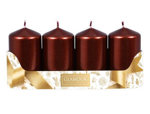 Súprava adventných sviečok. Majú tvar valca a povrch majú hladký, v úprave metalický lesk. Sú jednoduché a zároveň veľmi efektné. Doba horenia: 30 hodín. Rozmer: priemer 5 cm, výška 9 cm. Balenie obsahuje 4 ks sviečok. Farba: bordová.