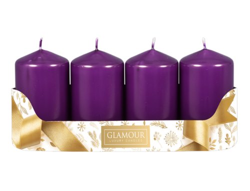 Súprava adventných sviečok. Majú tvar valca a povrch majú hladký, v úprave metalický lesk. Sú jednoduché a zároveň veľmi efektné. Doba horenia: 30 hodín. Rozmer: priemer 5 cm, výška 9 cm. Balenie obsahuje 4 ks sviečok. Farba: tmavo fialová.