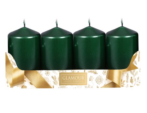 Súprava adventných sviečok. Majú tvar valca a povrch majú hladký, v úprave metalický lesk. Sú jednoduché a zároveň veľmi efektné. Doba horenia: 30 hodín. Rozmer: priemer 5 cm, výška 9 cm. Balenie obsahuje 4 ks sviečok. Farba: zelená.