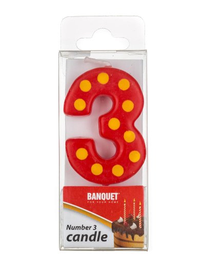 Sviečka narodeninová - číslo 3, veľkosť sviečky 5 x 3 cm, súčasťou sviečky je plastový bodec.